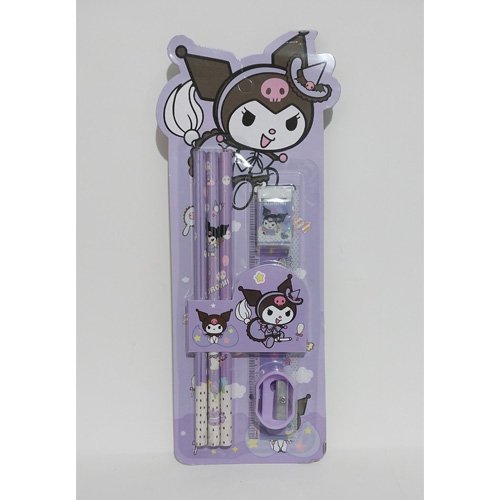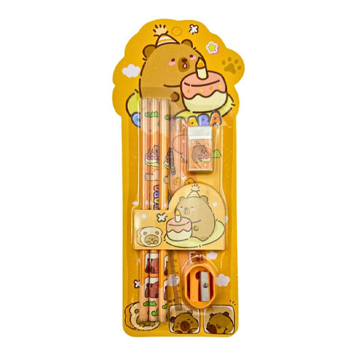 جنس اقلام : پلاستیک (تراش و خط‌کش)، چوب (مداد)، لاستیک (پاک‌کن)